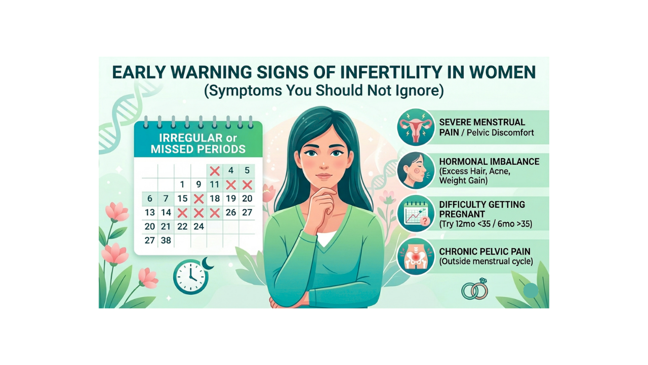 Early warning signs of infertility in women, including irregular periods, hormonal imbalance, and pelvic pain. Learn when to see a fertility specialist.